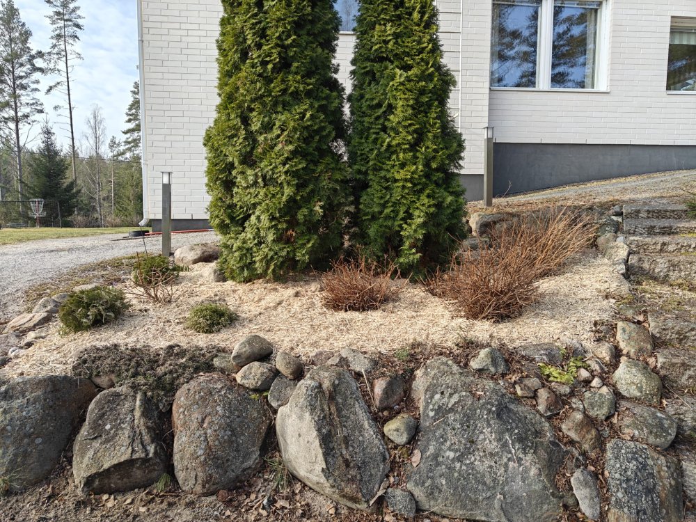 Sprid ett minst 10 cm tjockt lager täckmaterial runt planteringarna. Vattning efter spridning hjälper materialet att lägga sig på plats, men är inte nödvändig.